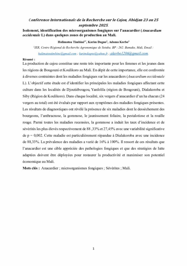 Isolement, identification des microorganismes fongiques sur l’anacardier (Anacardium occidentale L) dans quelques zones de production au Mali